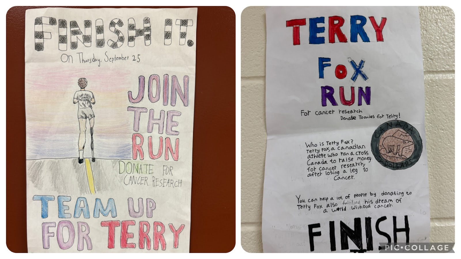 Our Kindergarten students were ready to begin their Terry Fox Run with the support of the Grade 7 students in Ms. Bouroukis’ class. The Grade 7 students made signs to encourage all of our students during the Terry Fox Run/Walk. The grade 7 students also created posters that were displayed around the school and wrote announcements leading up to the event. Such great leaders!